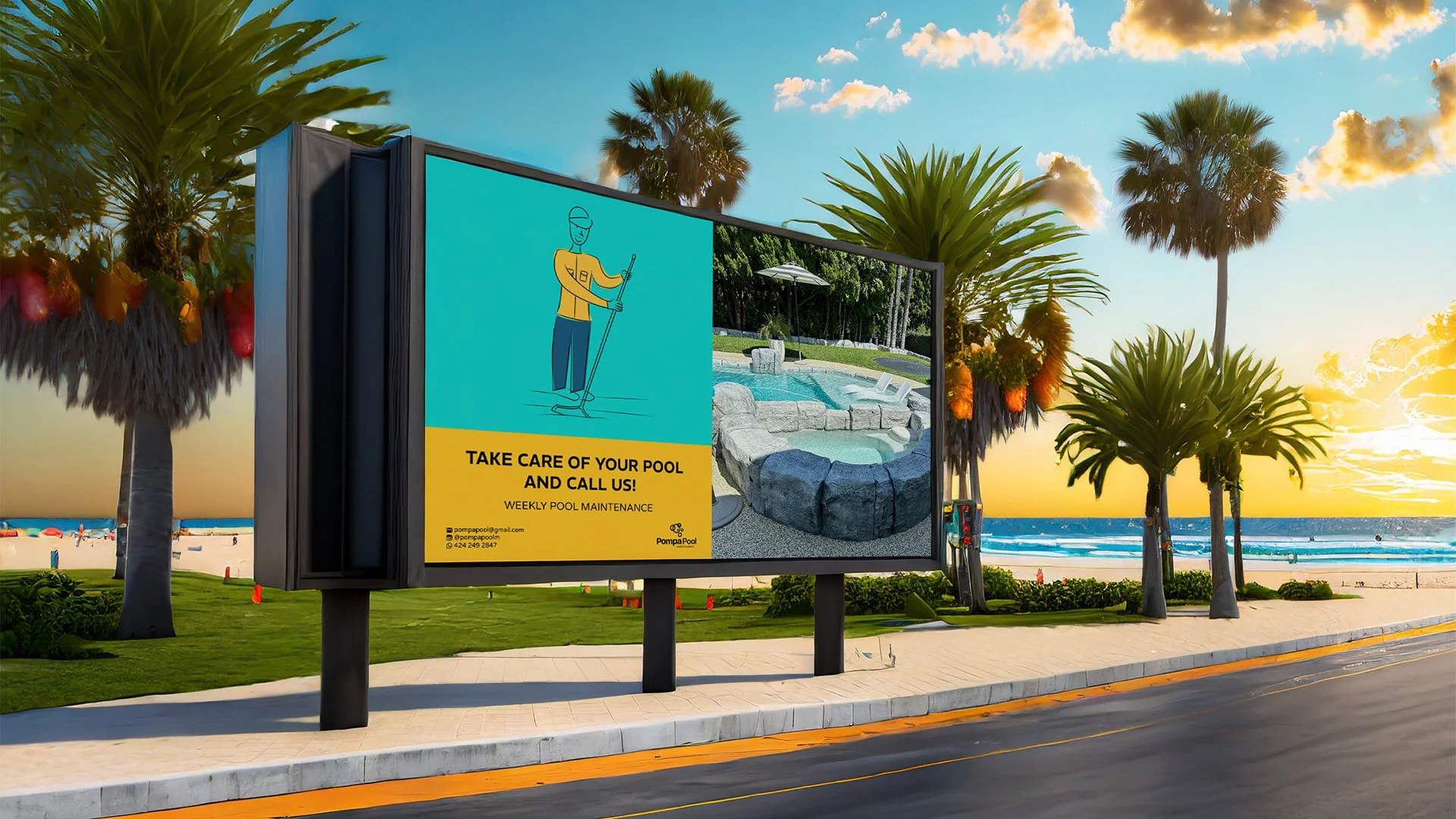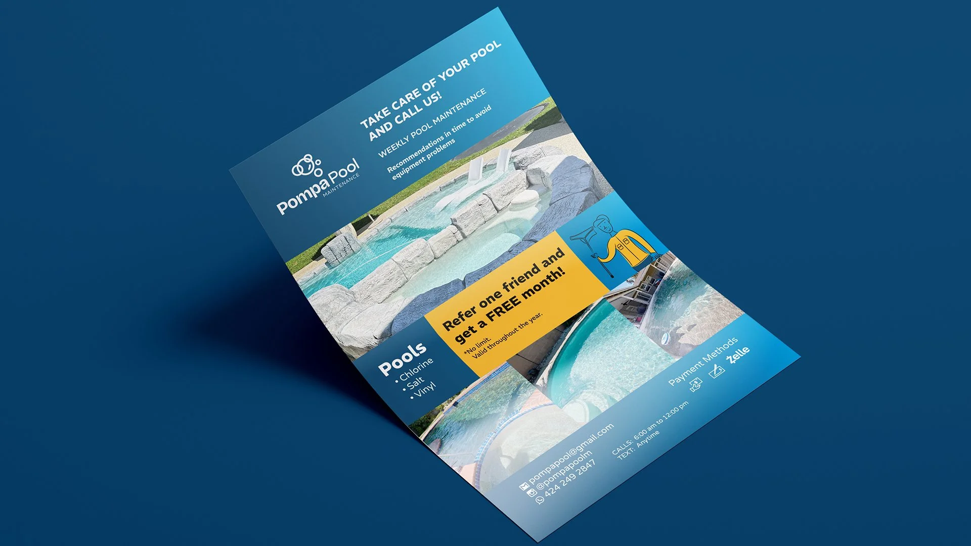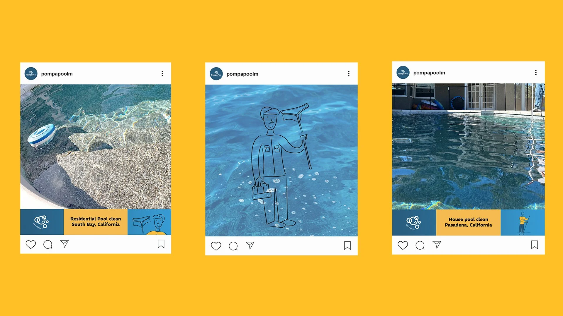 Pompa Pool es una marca especializada en mantenimiento y limpieza de albercas en el estado de California, USA. La empresa cuenta con fundadores que tienen años de experiencia en el área de la limpieza de piscinas residenciales, por lo que deciden fundar su propio emprendimiento dándole un toque más sofisticado y moderno en su séctor.